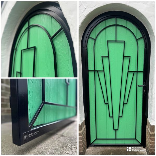 Art Deco metal designed gate with composite cladding, for a high quality and low maintenance finish.