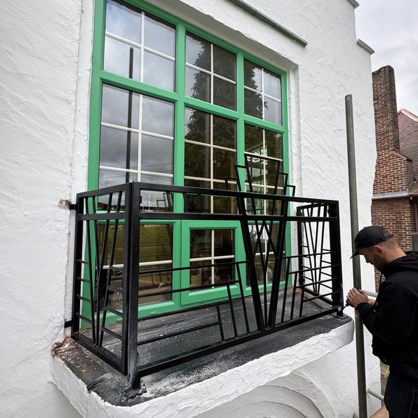 Art Deco designed metal balcony. Manufactured to match with the gates all in keeping with the style of the house.
